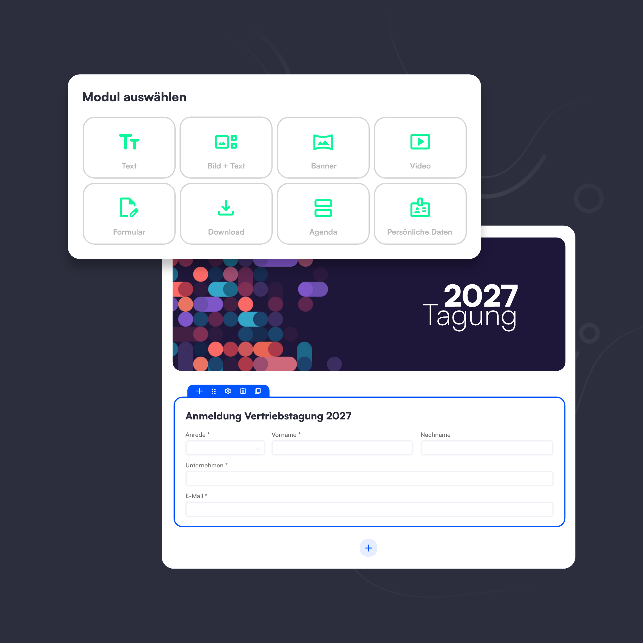 Mit dem Website- und E-Mailbaukasten erstellst Du eigene Webseiten und E-Mails nach Deinen Wünschen. Ein professioneller Auftritt für Deine Event-Webseite und Einladungsmailings – alles in Deinem Corporate Design. Ordne erstellte Formularfelder und Content beliebig aneinander. Copy-Paste Mails aus z.B. Outlook gehören der Vergangenheit an. Versende Deine generierten E-Mails einfach über den in bob6 integrierten Mailer. Deine Gäste oder Teilnehmenden werden persönlich und individuell angeschrieben. Das alles ohne Programmierkenntnisse!